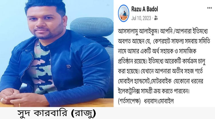 এরপর তিনি কোন সনদপত্র না নিয়েই কেশরহাটে ‘সাফল্য সমবায় সমিতি’ নামের একটি প্রতিষ্ঠান খুলে বসেন। সুদ বইয়ের মাধ্যমে রাজু তার অবৈধ দাদন ব্যবসাকে বৈধ দেখিয়ে মোহনপুর-কেশরহাটের সাধারন মানুষদের প্রতারিত করছেন। সাধারণ মানুষ প্রতারিত হলেও দিন দিন আঙ্গুল ফুলে কলা গাছ বনে গেছে রাজু।