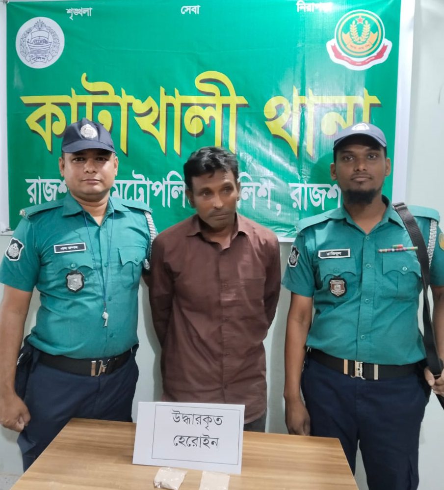 ঘটনা সূত্রে জানা যায়, আজ ১ এপ্রিল ২০২৪ খ্রিস্টাব্দ(৩১ মার্চ দিবাগত) রাতে আরএমপি’র মতিহার বিভাগের উপ-পুলিশ কমিশনার মধুসুদন রায়ের সার্বিক তত্ত্বাবধানে অতিরিক্ত উপ-পুলিশ কমিশনার মো: একরামুল হক, পিপিএম-এর দিকনির্দেশনায় সহকারী পুলিশ কমিশনার (অতিরিক্ত পুলিশ সুপার পদে পদোন্নতিপ্রাপ্ত) মো: আবুল কালাম আজাদের নেতৃত্বে কাটাখালী থানার অফিসার ইনচার্জ মো: তৌহিদুর রহমান, এসআই সুমন কুমার সাহা ও তাঁর টিম থানা এলাকায় মাদকদ্রব্য উদ্ধার অভিযান ডিউটি করছিলো। এসময় তাঁরা গোপন সংবাদের ভিত্তিতে জানতে পারেন কুখ্যাত মাদক ব্যবসায়ী রফিকুল কাটাখালী থানার চৌমহনী বাজারে হেরোইন বিক্রির জন্য অবস্থান করছে।