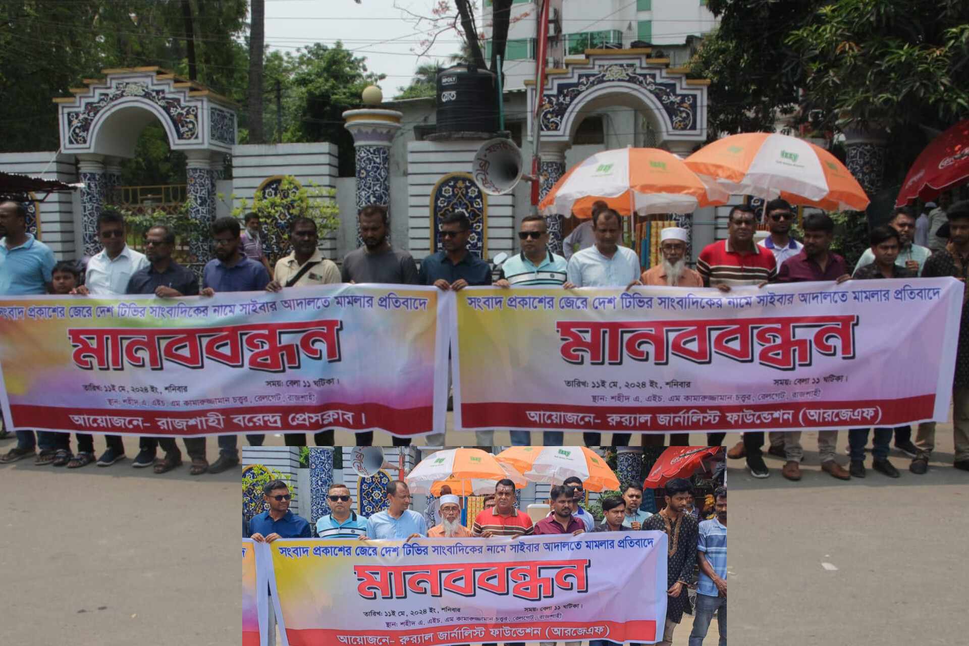 সাইবার নিরাপত্তা আইনে মামলার ঘটনায় বাংলাদেশ প্রতিদিন ও দেশ টিভির সাংবাদিক কাজী শাহেদের বিরুদ্ধে মামলা দায়েরের ঘটনায় প্রতিবাদ ও নিন্দা জানিয়ে মানববন্ধন করেছেন রাজশাহী বরেন্দ্র প্রেসক্লাব ও রুর্যাল জার্নালিস্ট ফাউন্ডেশন (আরজেএফ) রাজশাহী শাখা। দ্রুত সাইবার নিরাপত্তা আইনে করা মামলা নিঃশর্তে প্রত্যাহারের দাবী জানানো হয় মানববন্ধনে।