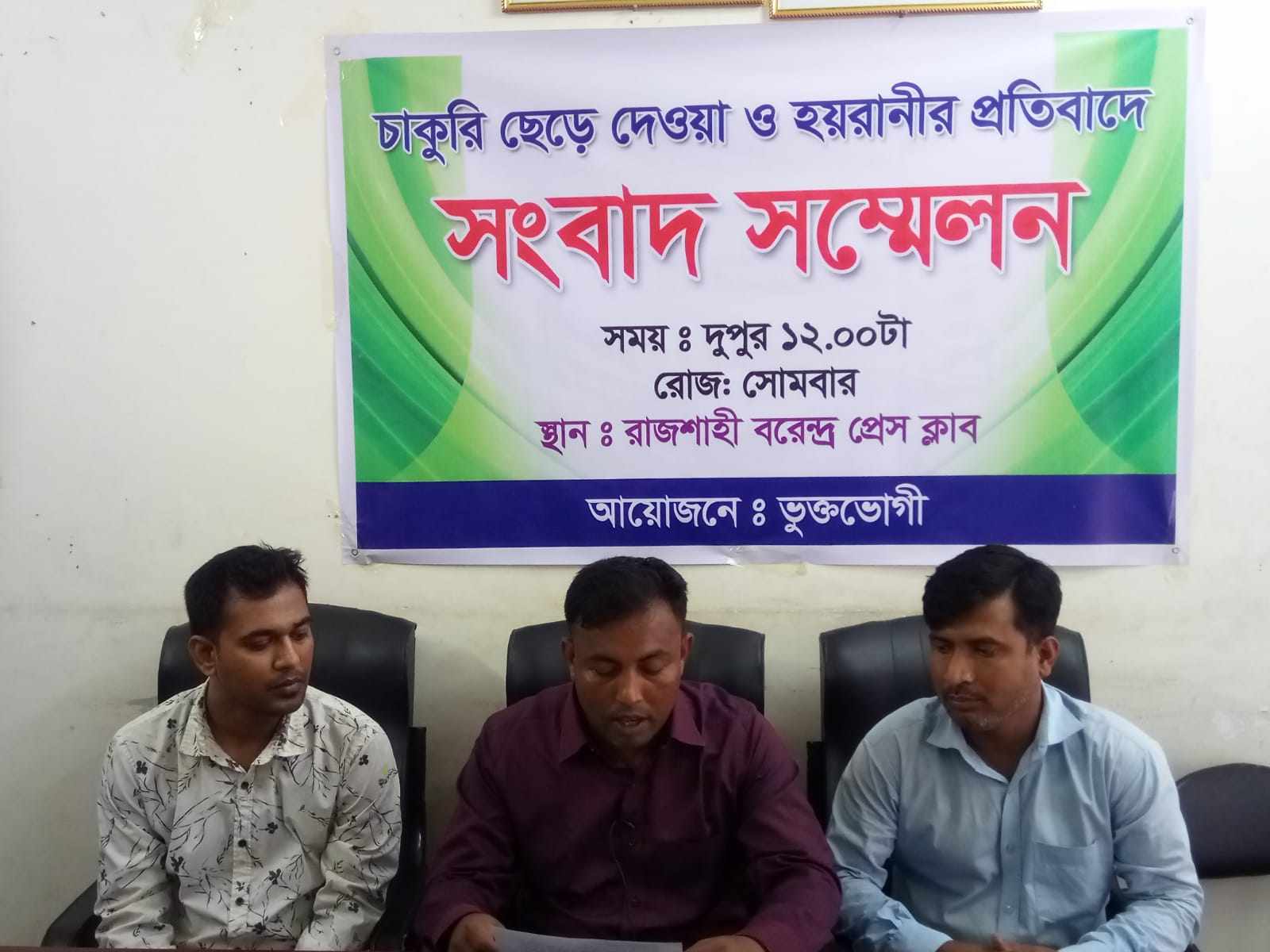 রাজশাহীতে গ্রীন প্লাজা রিয়েল এস্টেট কোম্পানী লিমিটেডে কর্মরত ৪ জন কর্মচারী চাকুরী ছেড়ে দেওয়ায় প্রতিষ্ঠানটির ব্যবস্থাপনা পরিচালক মোস্তাফিজুর রহমানের নানা হয়রানি ও ষড়যন্ত্রের প্রতিকার চেয়ে সংবাদ সম্মেলন করেছেন ভুক্তভোগীরা।