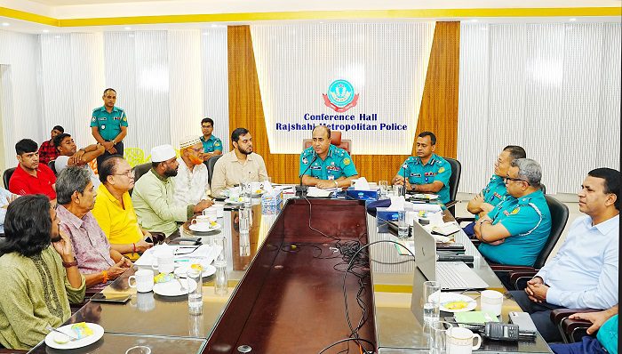 পুলিশ কমিশনার মহোদয় তাঁর বক্তব্যের শুরুতেই উপস্থিত পূর্জা উদ্যাপন কমিটির নেতৃবৃন্দ ও সদস্যগণকে আসন্ন শারদীয় দুর্গাপূজার অগ্রিম শুভেচ্ছা জানান। তিনি বলেন, সাম্প্রদায়িক সম্প্রীতি, ধর্মীয় ভাবগাম্ভীর্য ও শৃঙ্খলা বজায় রেখে পূজা উদযাপনের লক্ষ্যে আরএমপি’র পক্ষ থেকে সার্বিক নিরাপত্তা ব্যবস্থা গ্রহণ করা হয়েছে। প্রতিমা প্রস্তুত করণ, প্রতিমা প্রস্তুত কালীন এবং পূজা চলাকালীন নিরাপত্তা নিশ্চিত করার লক্ষ্যে সকল প্রকার আইনগত ব্যবস্থা গ্রহণ করা কয়েছে।