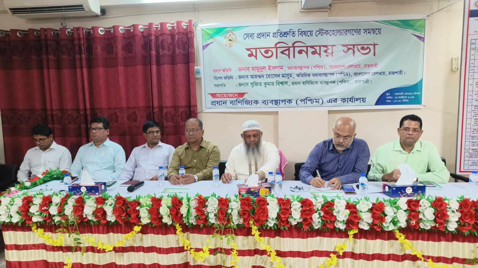 মতবিনিময় সভায় পশ্চিমাঞ্চল রেলওয়ের প্রধান বাণিজ্যিক ব্যবস্থাপক সুজিত কুমার বিশ্বাস’র সভাপতিত্বে প্রধান অতিথি হিসেবে উপস্থিত ছিলেন, বাংলাদেশ পশ্চিম রেলওয়ের মহাব্যবস্থাপক মামুনুল ইসলাম। বিশেষ অতিথি হিসেবে উপস্থিত ছিলেন, বাংলাদেশ পশ্চিমাঞ্চল রেলওয়ের অতিরিক্ত মহাব্যবস্থাপক আহম্মদ হোসেন মাসুম।