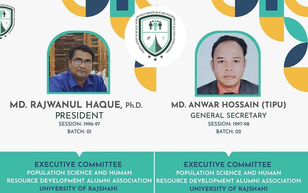 রাজশাহী বিশ্ববিদ্যালয়ের (রাবি) পপুলেশন সায়েন্স এন্ড হিউম্যান রিসোর্স ডেভেলপমেন্ট বিভাগের অ্যালামনাই অ্যাসোসিয়েশনের নতুন কার্যনির্বাহী কমিটি গঠন করা হয়েছে। এতে সভাপতি হিসেবে নির্বাচিত হয়েছেন বিভাগের প্রাক্তন শিক্ষার্থী ও বর্তমানে ডক্টরাল গবেষক মো. রেজোয়ানুল হক এবং সাধারণ সম্পাদক হিসেবে নির্বাচিত হয়েছেন মো. আনোয়ার হোসাইন (টিপু)।